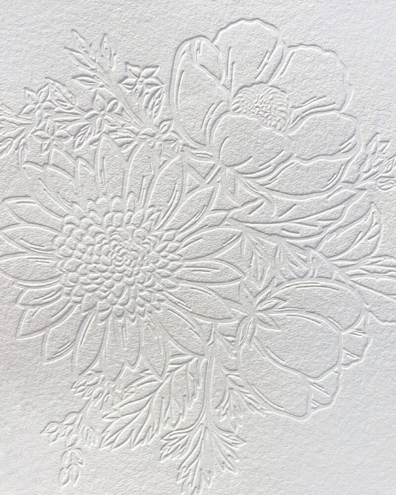 A technique where the design is pressed into the paper without ink, creating a subtle, tonal impression. Think of it as letterpress with the ink removed — the texture is there, but the effect is quiet and refined.