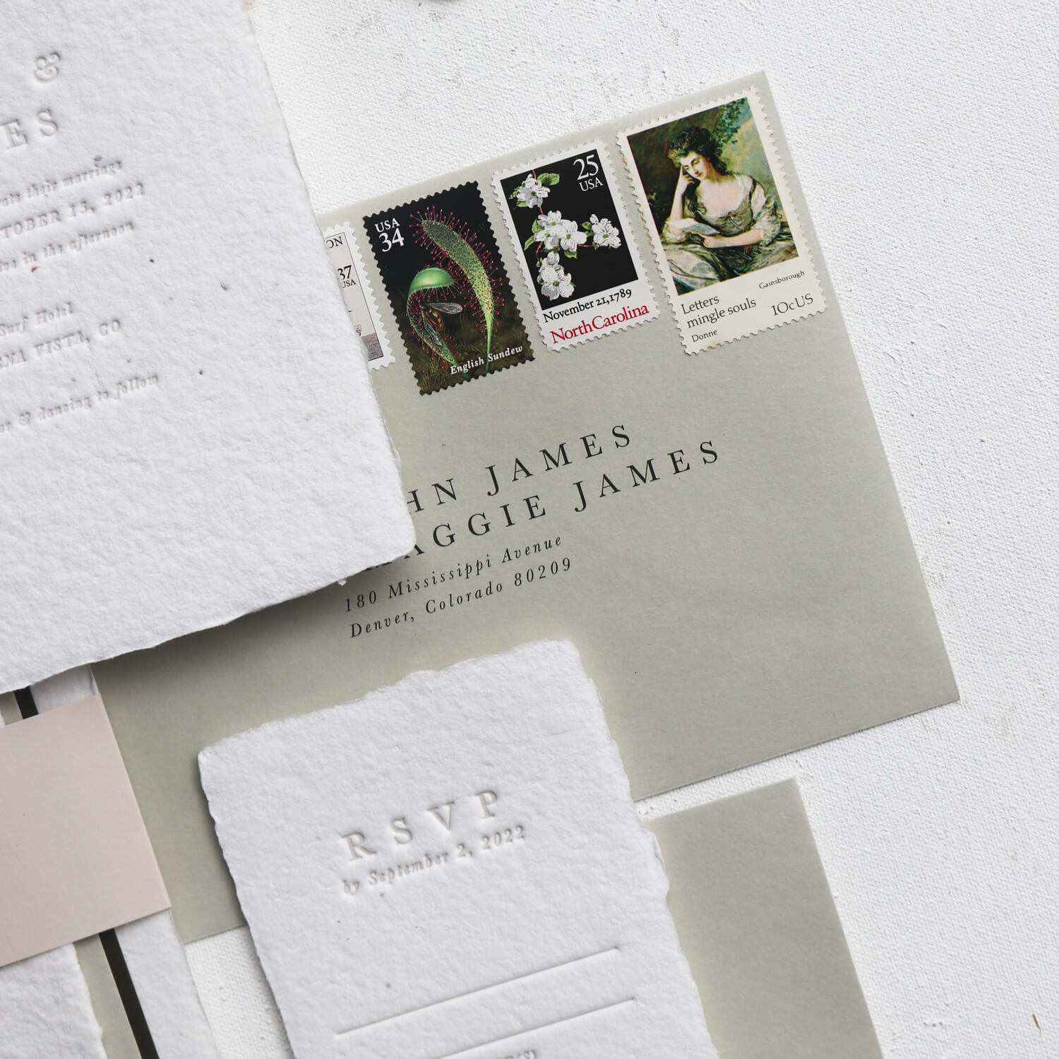On stamps: If the current USPS offerings feel uninspiring, vintage stamps are worth considering. They’re unused, fully valid for postage, and a beautiful way to carry your suite’s aesthetic all the way to the envelope.