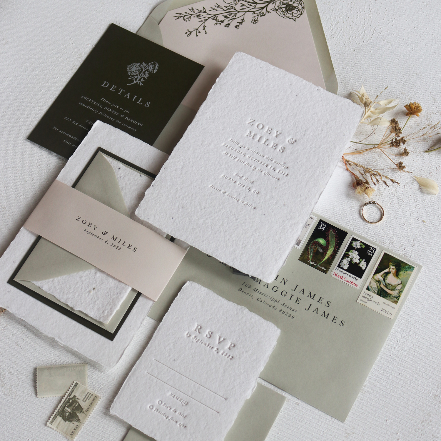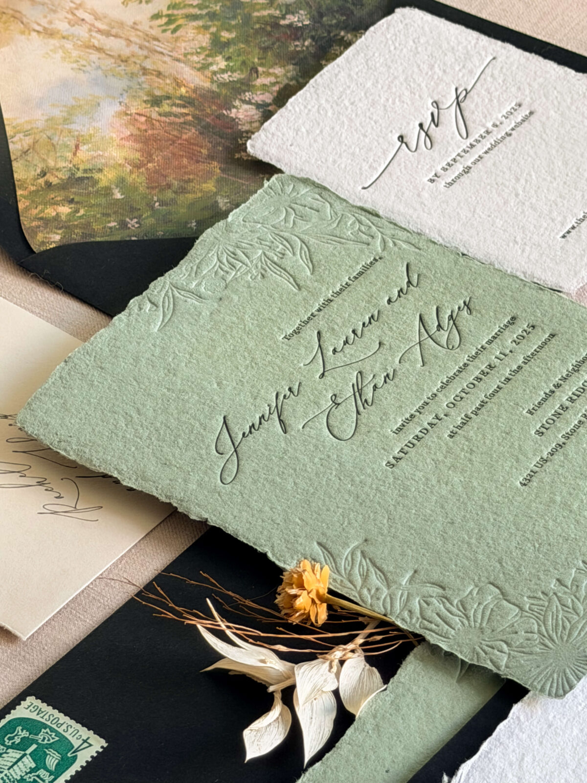 Foil and letterpress can also be combined—letterpress for the main text, foil for a monogram or floral detail—to create something that feels genuinely luxurious without going overboard.